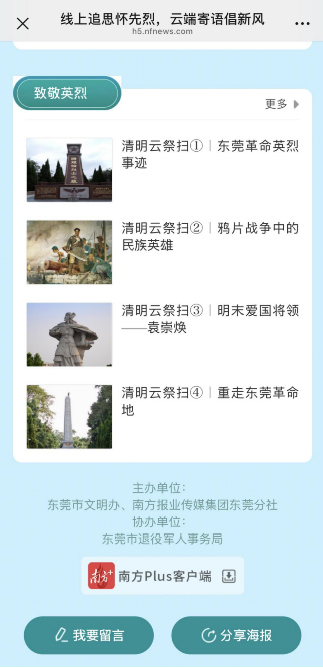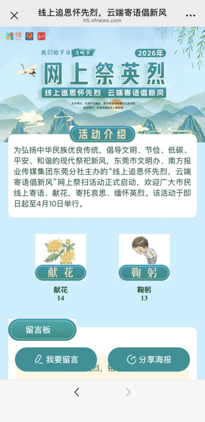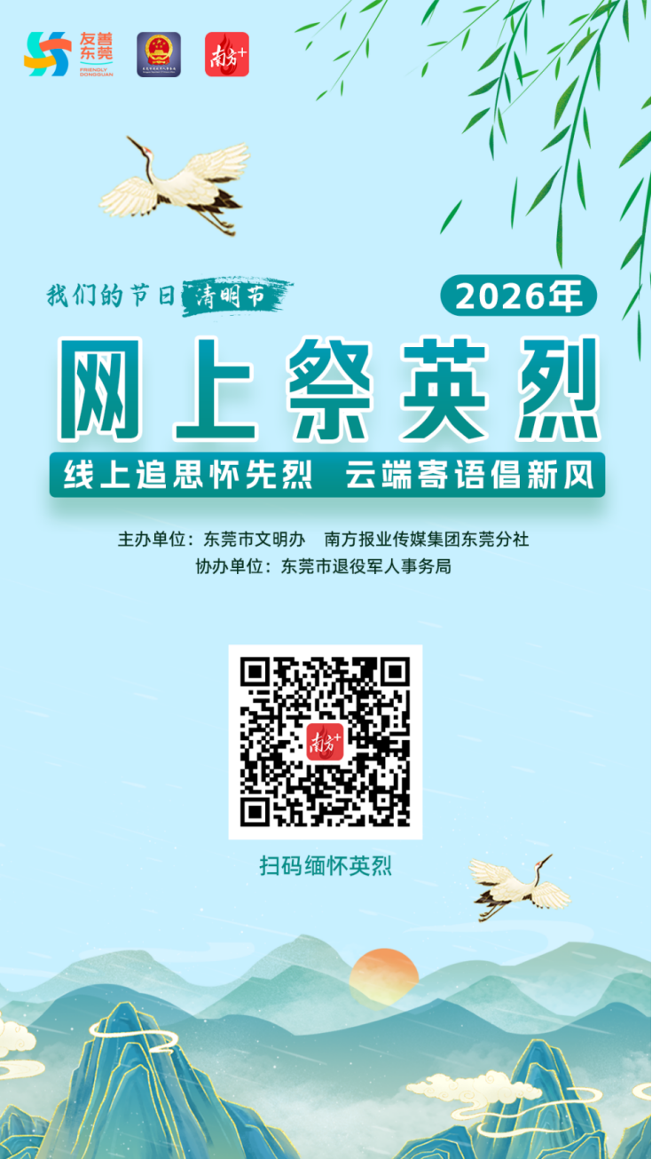 清明寄哀思,新风缅故人。为弘扬中华民族优良传统,倡导文明、节俭、低碳、平安、和谐的现代祭祀新风,由东莞市文明办、南方报业传媒集团东莞分社主办,东莞市退役军人事务局协办的“线上追思怀先烈,云端寄语倡新风”网上祭扫活动启动。即日起,广大市民可通过线上平台,以云端献花、寄语留言等绿色环保形式,缅怀先烈、寄托思念。